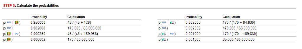 And now, with our contingency tables complete, we have a full picture of our estimates around base rates and the likelihoods of the profiles matching the descriptions. All the conditional and marginal probabilities from the Bayes formula are now represented here and can be calculated as follows: