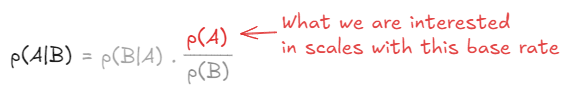 The second insight is that these two conditional probabilities are related to each other, so knowing one can lead us to the other. What we need in order to connect the two are the individual base rates of A and B, and the scaling factor is in fact a simple ratio of the two base rates as follows: